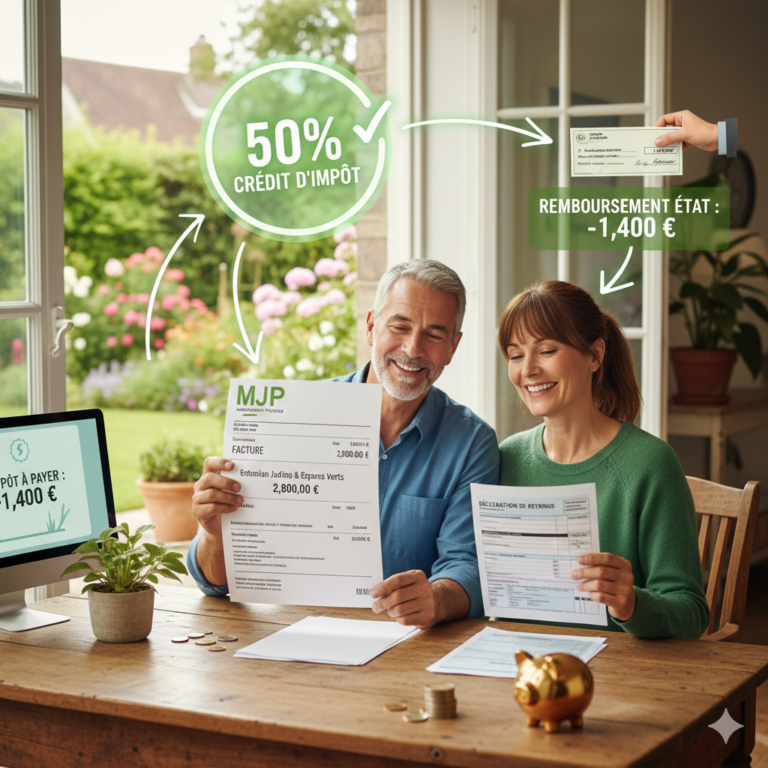 Les clients de MJP peuvent bénéficier d’un crédit d’impôt correspondant à 50 % du montant des travaux d’espaces verts. Cette aide est accordée par l’État sur présentation de la facture, lors de la déclaration de revenus. Le montant du crédit d’impôt est soit déduit de l’impôt à payer, soit remboursé si le client n’est pas imposable.